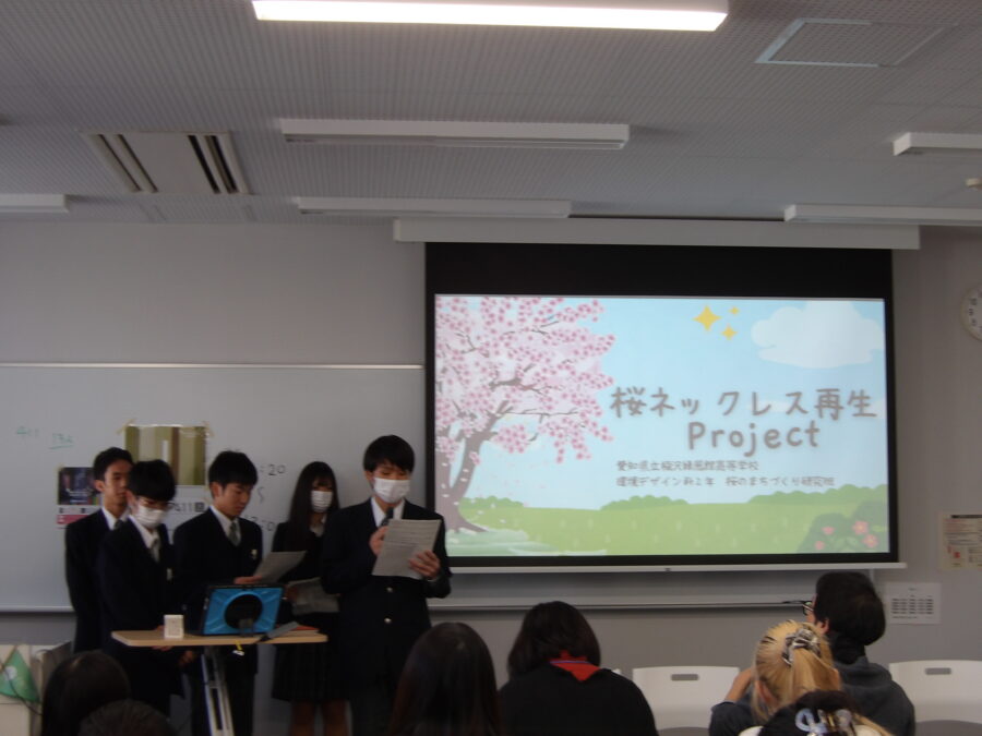 全国高校生マイプロジェクトアワード愛知県サミットが1月12日(月)に名城大学ナゴヤドーム前キャンパスで実施され、環境デザイン科2年生が参加しました。環境デザイン科では、本年度より稲沢市平和町の「桜ネックレス」の再生活動に取り組んでおり、その内容を発表してきました。緊張しながらも、堂々と発表することができました。様々なご意見や、アドバイス等をいただき、今後の活動の参考となりました。また、他校の様々なプロジェクトを見ることで、良い刺激となりました。