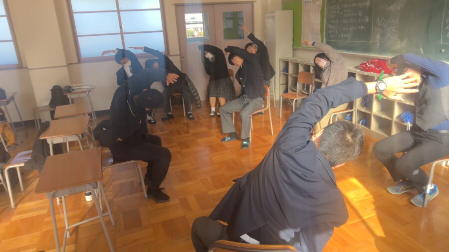 いよいよ入試本番が近づいている普通科3年生。冬休みも補習授業で頑張っています。午後の補習が始まる前には体育の先生による体操が行われています。体をほぐして、午後からも全力です!!