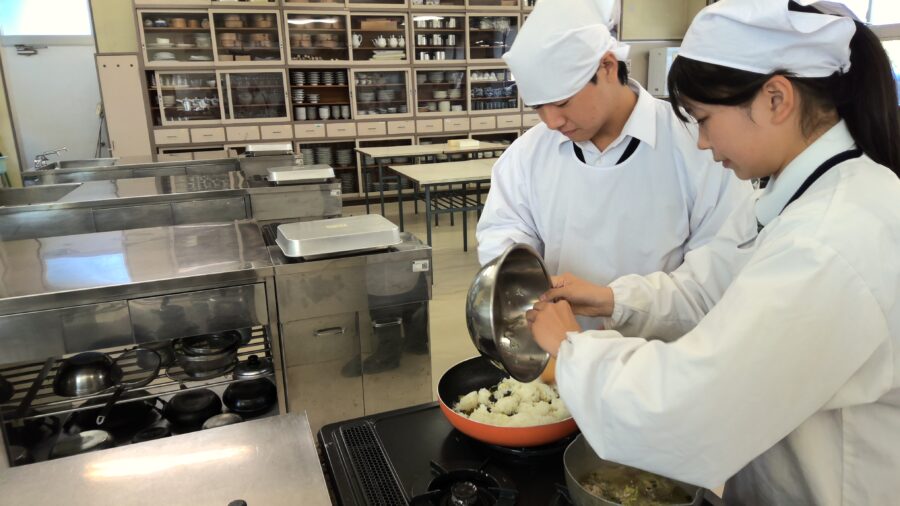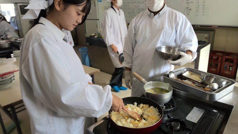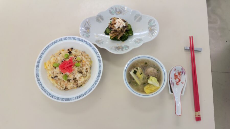 今回の実習では、中華料理の炒飯、白菜丸子湯(白菜と肉だんごスープ)、拌黄瓜(きゅうりの和え物)を作りました。炒飯にはカニの身を使い、パラパラになるよう、油とご飯、具材をしっかりとからませて作り、盛り付けにもこだわりました。蛇腹きゅうりは、細かい切れ目を入れることで味が染みこみやすくなります。3品作るのは時間がかかりましたが、味のバランスも良く、おいしく食べることができました。