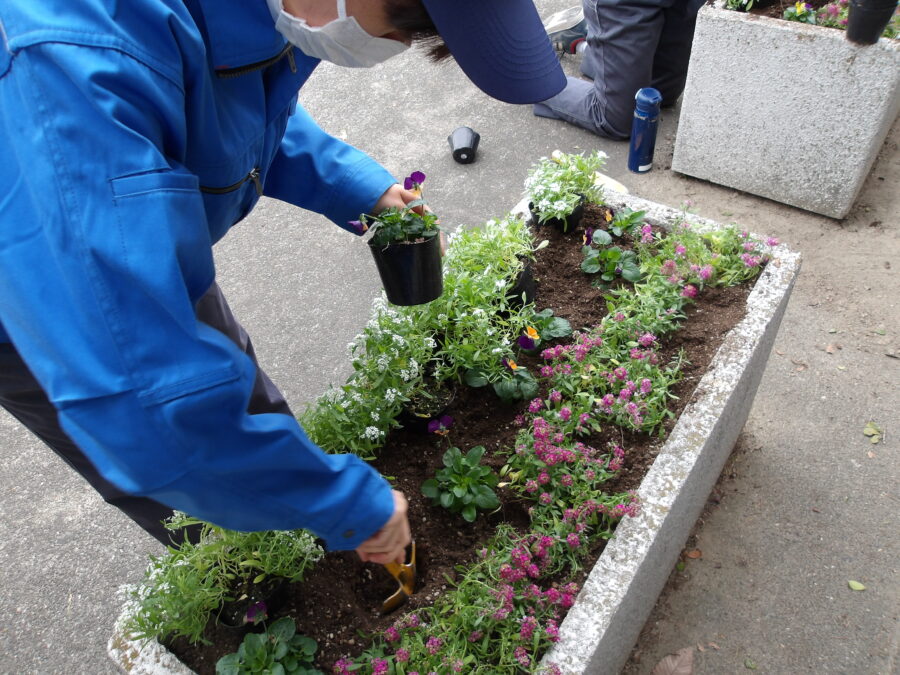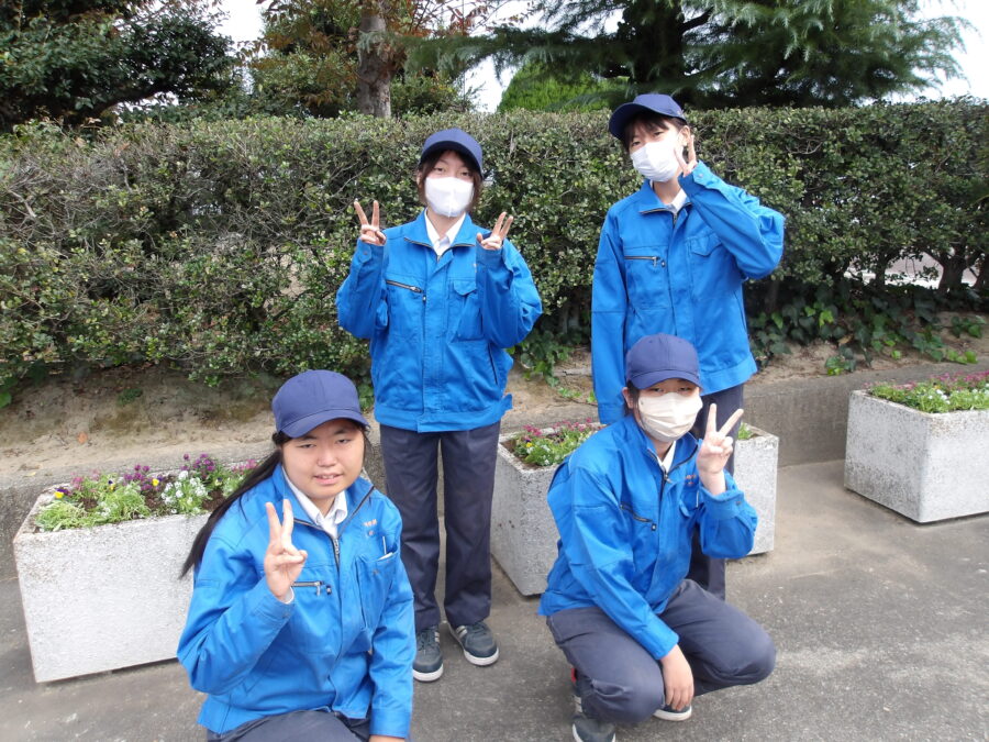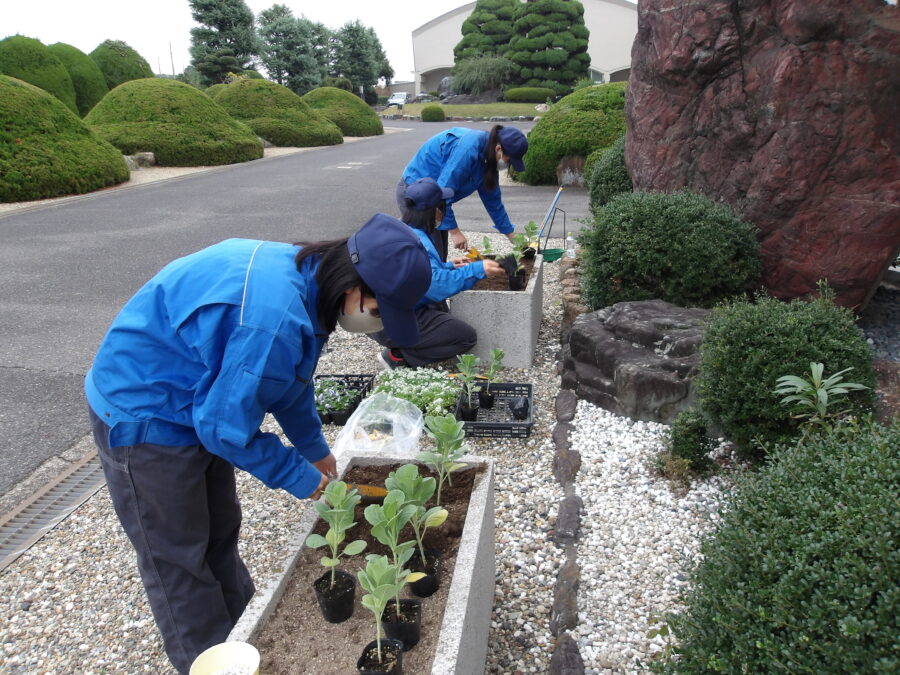 2025.11.06 生活科学科学科ブログ 生活科学科2年総合実習 花壇作り 生活科学科2年生活コースの総合実習で、年に3回、花壇作りをしています。今回、寒さに強いビオラ、パンジー、アリッサム、ハボタンを植えて冬の花壇を作りました。文化祭が近づき、正門や玄関前をきれいに飾ることができました。