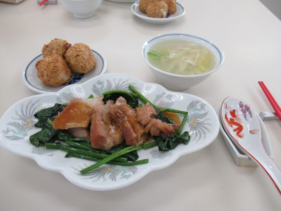 生徒の感想「ごまだんごを成形するのが大変だった。揚げているときにあんが出てきたり、割れたりしてしまった。東坡肉は、豚肉にとても味がしみていて、美味しくできました。」