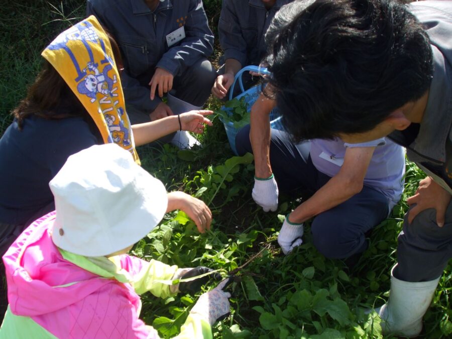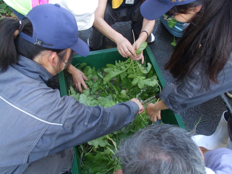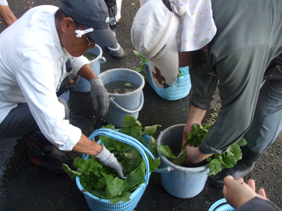 10月1日(水)のふれあい農園は、ダイコンの間引きと除草、サツマイモのつる上げを行いました。直前にザーッと雨が降り、畑がぬかるんでいたので、転倒に気を付けて農作業を行いました。間引きしたダイコンも食べることができるので、洗ってから皆で持ち帰りました。
