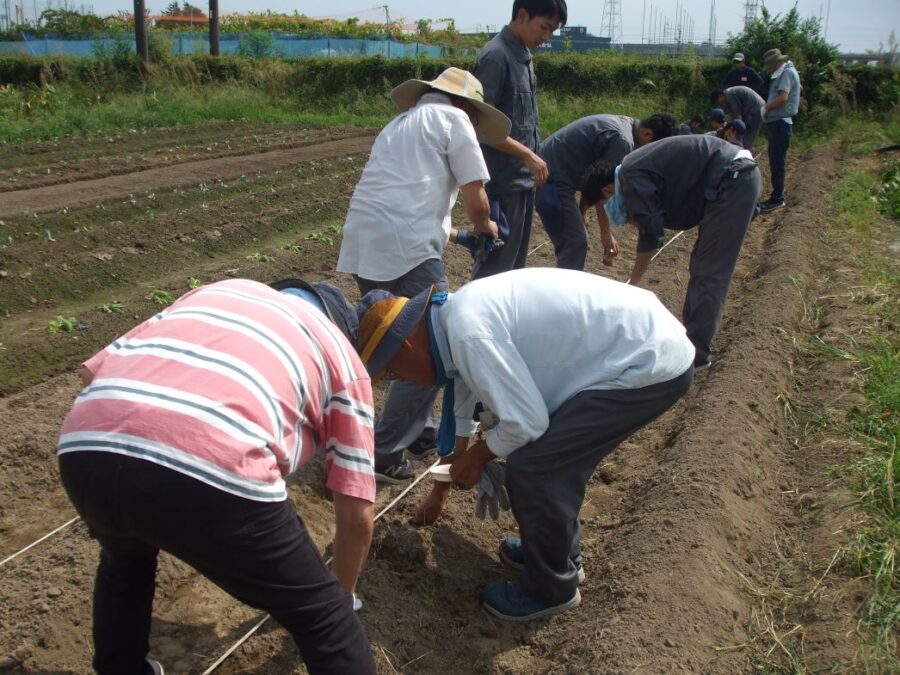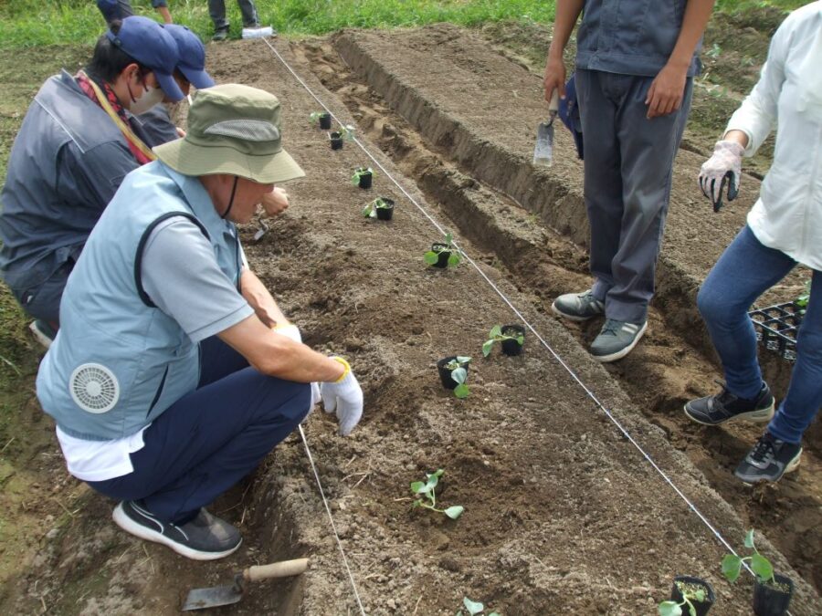 9月10日(水)のふれあい農園は、カリフラワーの定植、キャベツの播種、サツマイモのつる上げを行いました。カリフラワーの定植では、株間などをメジャーで測定し、位置を決めてから定植をしました。今は収穫物がなくて寂しいですが、次の収穫のために、準備を進めていきます。