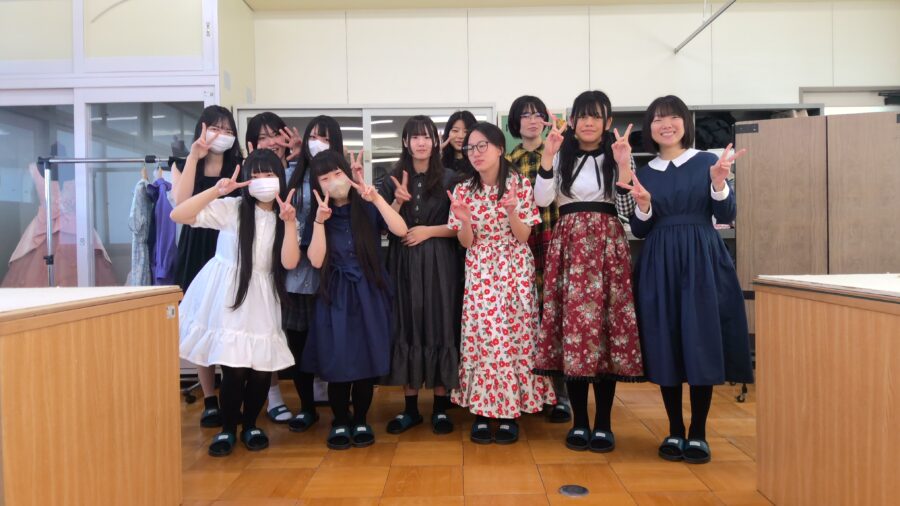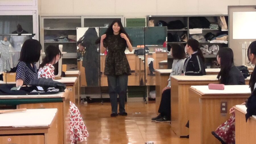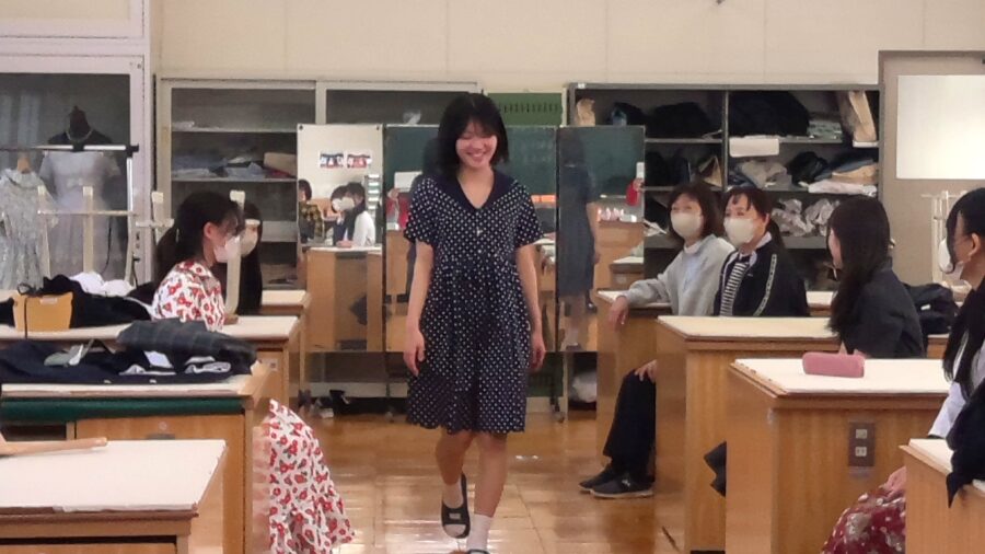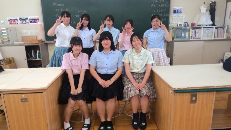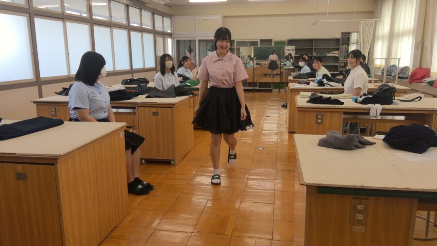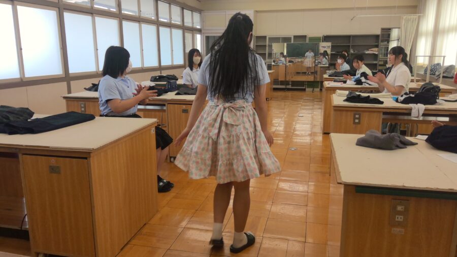 2年生は、ティアードスカートを製作しました。来年度のドレスづくりに活かせるよう意識して取り組みました。今年度授業の最後に試着会をしました。